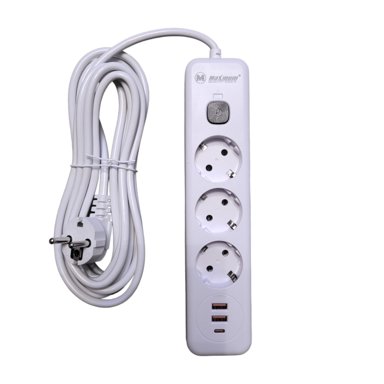 Наличие двух USB-портов позволяет заряжать большинство мобильных устройств: телефонов, планшетов, фотоаппаратов, плееров, IPhone, Ipad и т.д. Также предусмотрен вход для кабеля Type C. Сетевой тройник с переключателем имеет номинальное напряжение 220 В, номинальный ток 16 А, степень защиты от пыли и воды IP 20.