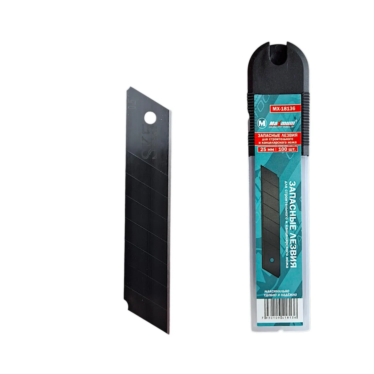 Стандартный размер 25х100 мм и толщина 0,5 мм подходят для большинства моделей строительных (обойных) ножей.