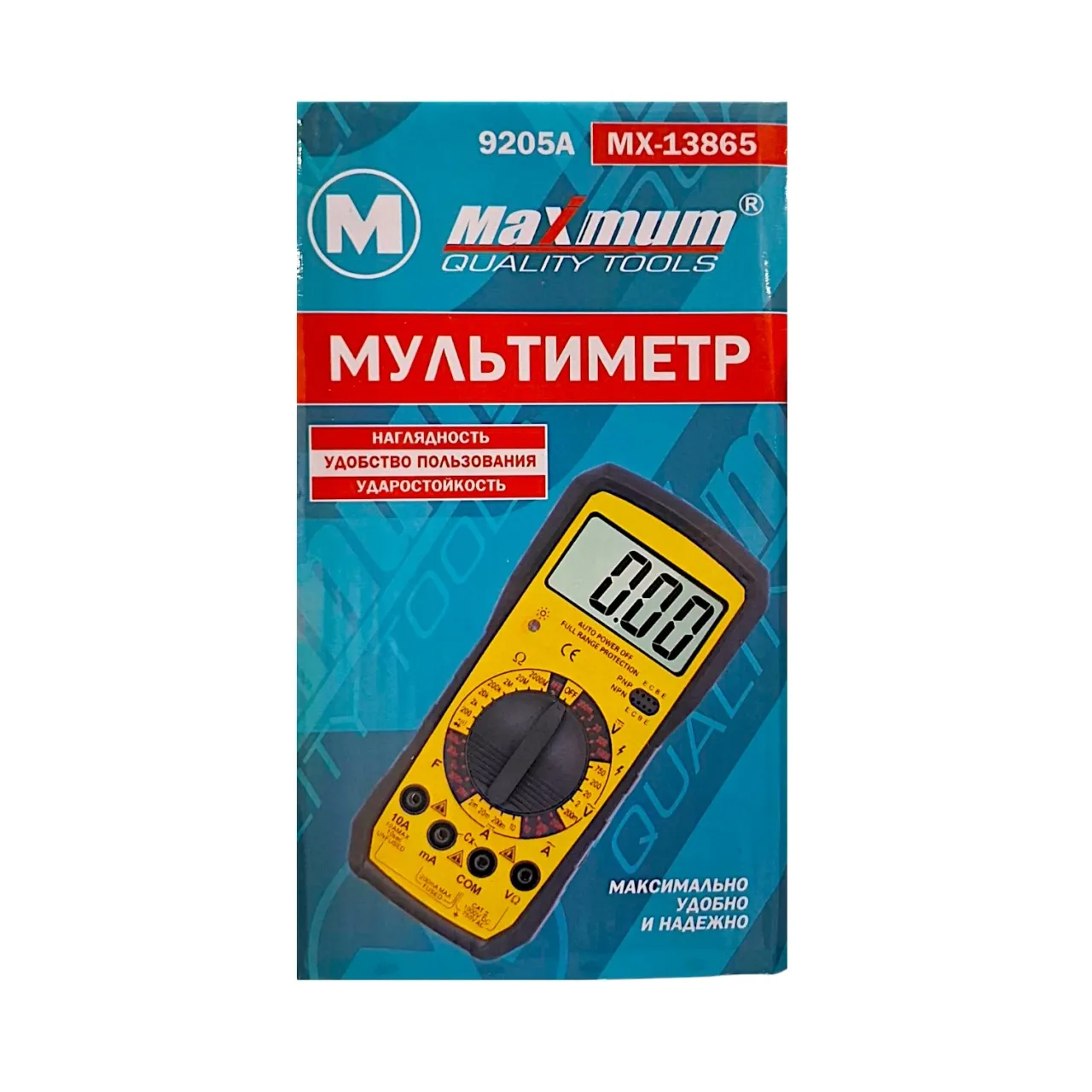 Мультиметр цифровой от "Maximum Quality Tools" предназначен для измерения тока, напряжения, сопротивления, параметров диодов и транзисторов. Питание от 9 V “Крона ” — поставляется в комплекте. В комплект входит пара тестовых контактов (красный и черный).
