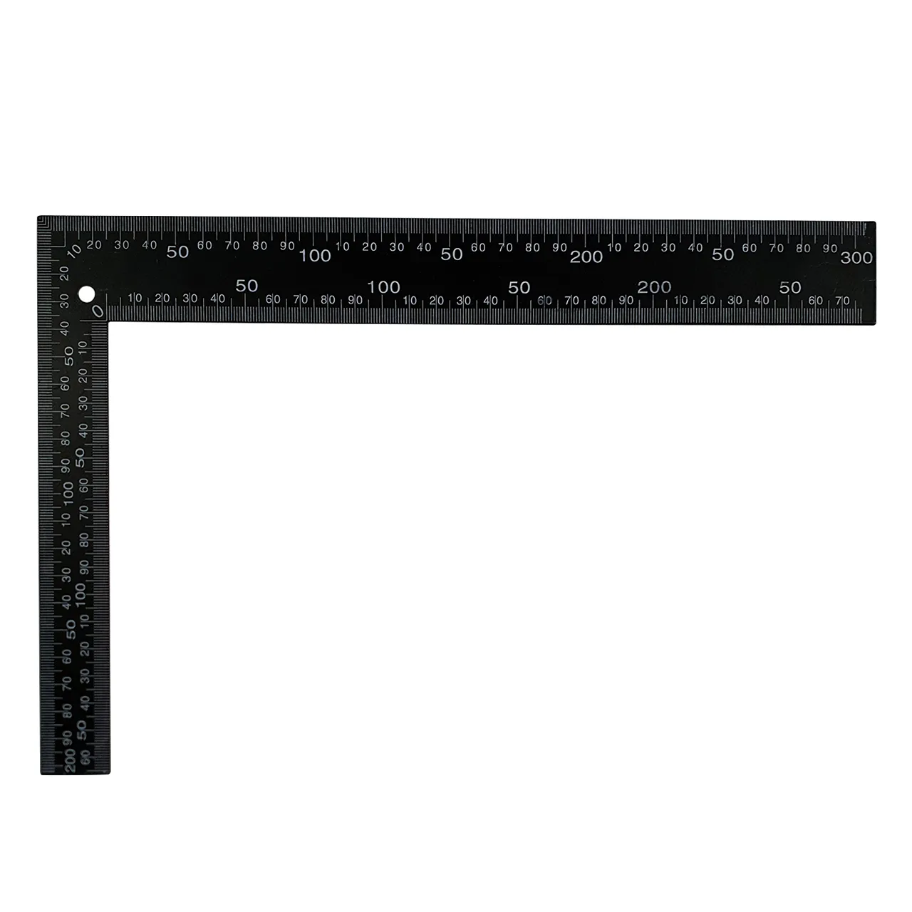 Угольник столярный 200x300 мм черный существенно облегчит процесс проверки и разметки прямых углов при сборке конструкций и обработке деталей. Возможность контроля угла 45° за счет формы основания и специальной разметки 0.
