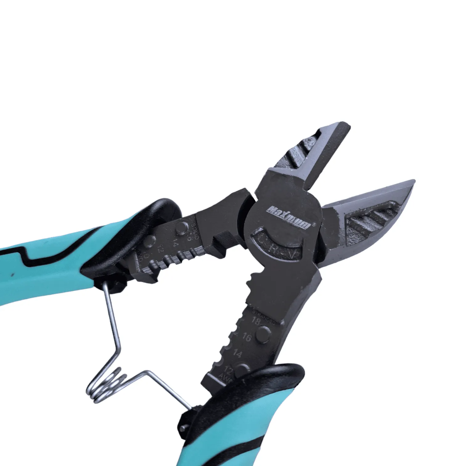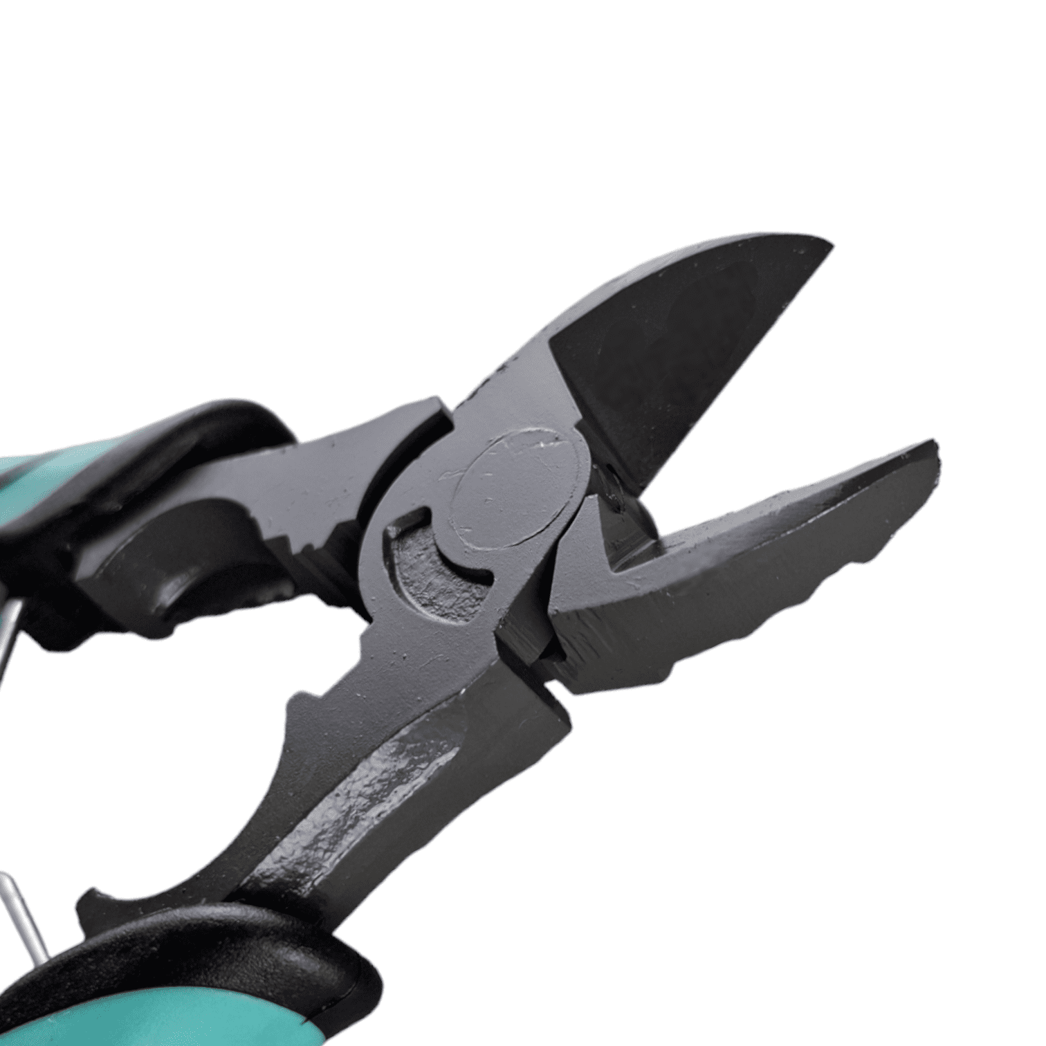 Рабочая часть из оксидированной стали делится на три сектора: плоские губки для захвата тонких деталей (листы, проволока), круглая выемка с гранями для перекусывания резьбовых и цилиндрических элементов (гайки, болты), и резцы с указанием диаметра для перекусывания и зачистки проводов.