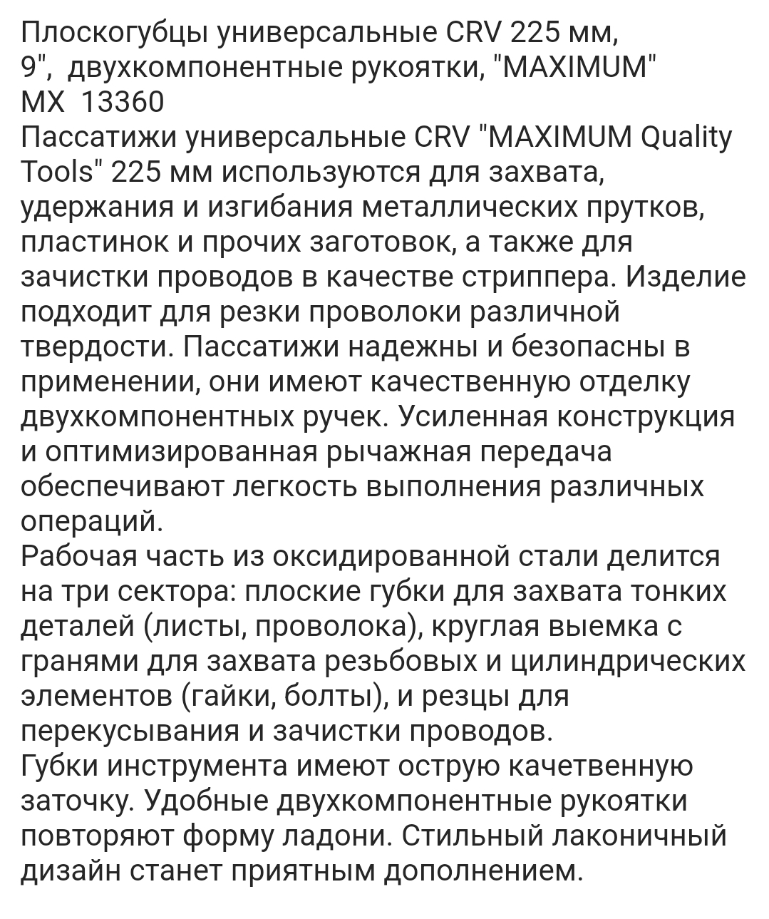 Рабочая часть из оксидированной стали делится на три сектора: плоские губки для захвата тонких деталей (листы, проволока), круглая выемка с гранями для захвата резьбовых и цилиндрических элементов (гайки, болты), и резцы для перекусывания и зачистки проводов.