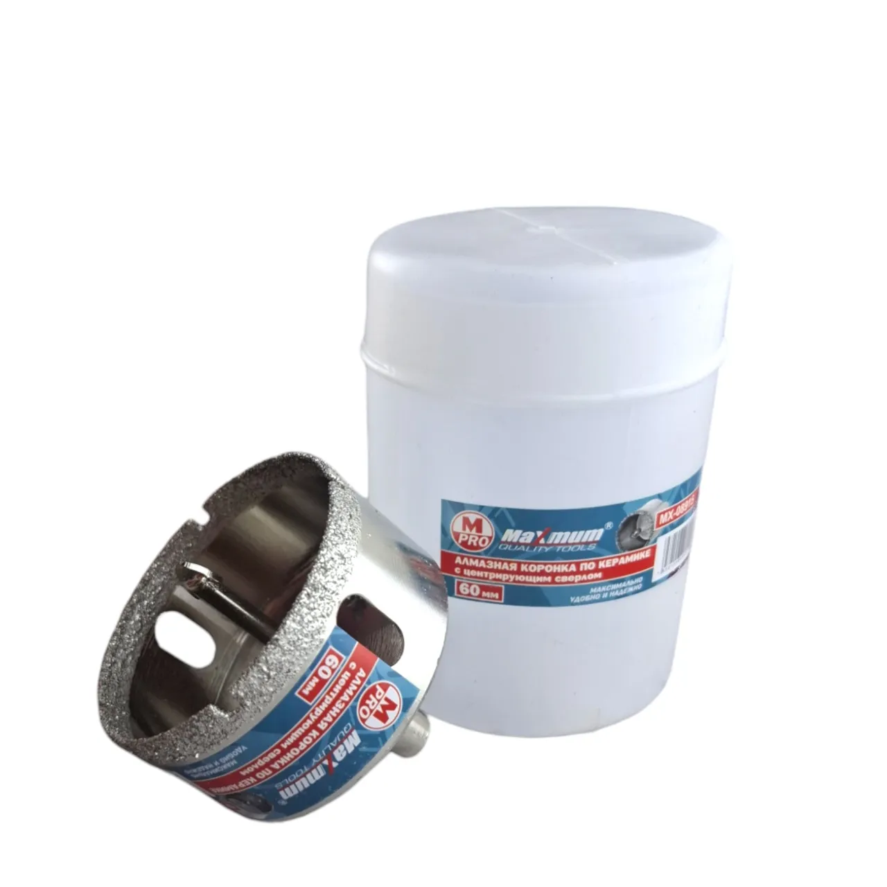 Коронка по стеклу и керамике с центрирующим сверлом 60 мм предназначена для сверления отверстий в керамической, керамогранитной и кафельной плитке при обязательном водяном охлаждении. В комплект входит центрирующее сверло, которое исключает возможность смещения инструмента во время работы. Равномерное распределение алмазного зерна на поверхности рабочей части обеспечивает аккуратное и быстрое сверление материала без сколов. Коронка выполнена из нержавеющей высокопрочной стали.