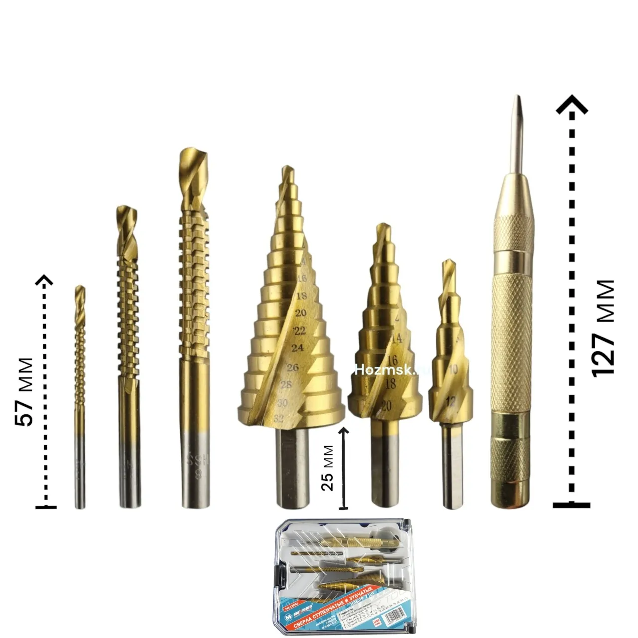 HSS сверла в данном наборе универсальны и различны по своему типу и назначению. Набор включает в себя три ступенчатых сверла, три сверла-фрезы и кернер.