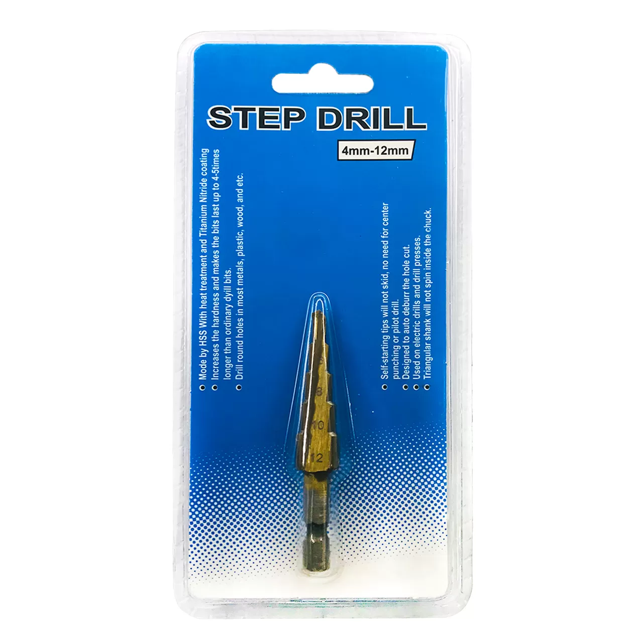 Универсальное ступенчатое сверло 4 - 12 мм используется работы с листовым металлом и заменяет целый набор сверл. Насадка имеет шестигранный хвостовик. 5 ступеней помогают создать оптимальный и точный замер. Такая специфическая конструкция усиливает режущую способность и существенно увеличивает плавность обработки металла.